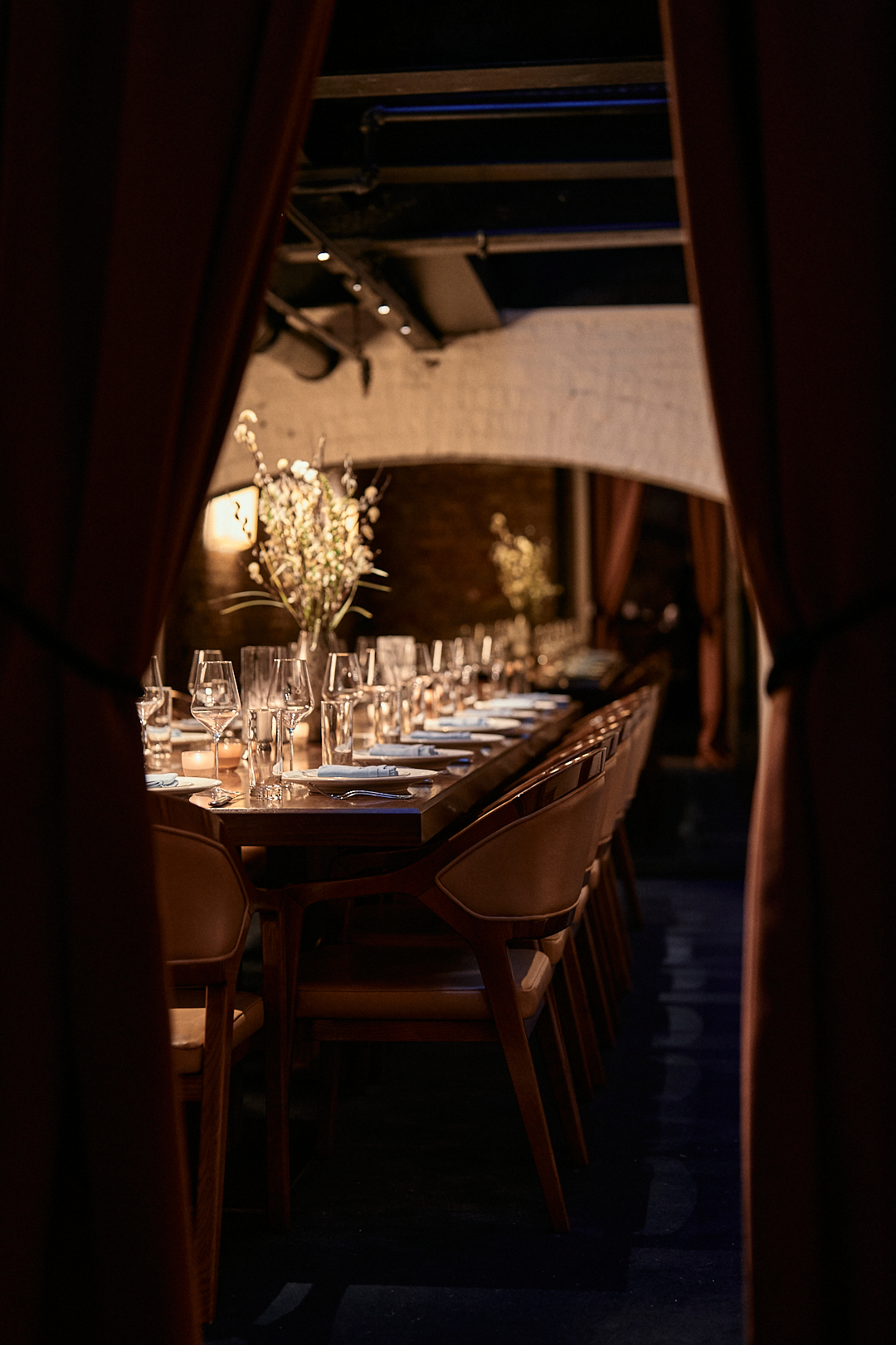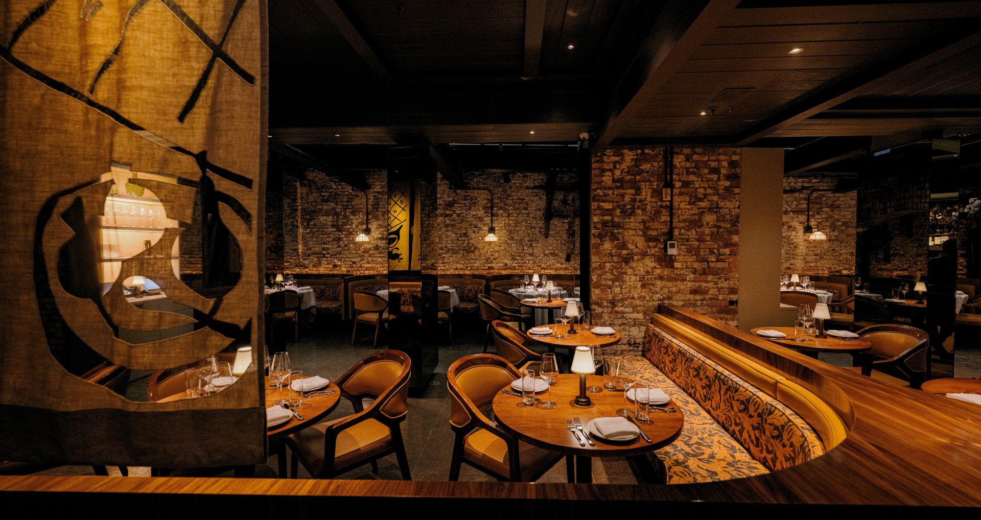 At the entrance of Sartiano’s in New York, three panels stand like a suspended narrative, quietly commanding attention. Woven from natural linen and delicate black tulle, they filter the gaze, casting fragmented shadows that hint at fleeting gestures, whispered conversations, and the weight of shared silences. They mark a threshold between the bustling outside world and an intimate inner sanctuary, a space where time seems to pause and the senses attune to subtleties. Each panel invites the visitor to linger, to sense the soft interplay of light and shadow, and to step gently into a moment of quiet reflection and enveloping softness.